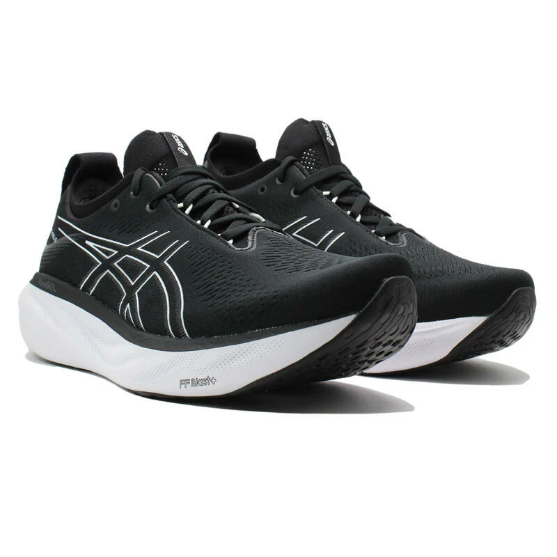 Schoenen Gel-Nimbus 25 – 1011B547-001 Zwart: De zachte dempingseigenschappen van de GEL-NIMBUS 25-schoen geven je het gevoel alsof je op wolken landt. Deze neutrale trainer is vernieuwd met nieuwe materialen die zorgen voor een zachtere en soepelere hardloopervaring. Een zacht, gebreid bovenwerk omhult je voet comfortabel en biedt geavanceerde ventilatie. De bijgewerkte gebreide kraagconstructie zorgt voor meer flexibiliteit en strekt zich uit rond de enkel voor een luxere pasvorm en gevoel. De tussenzool zit vol met de meeste demping die de serie tot nu toe heeft geboden. Door gebruik te maken van FF BLAST PLUS ECO-demping, creëert deze trainer een lichtere en zachtere dempingservaring met minder impact op het milieu.